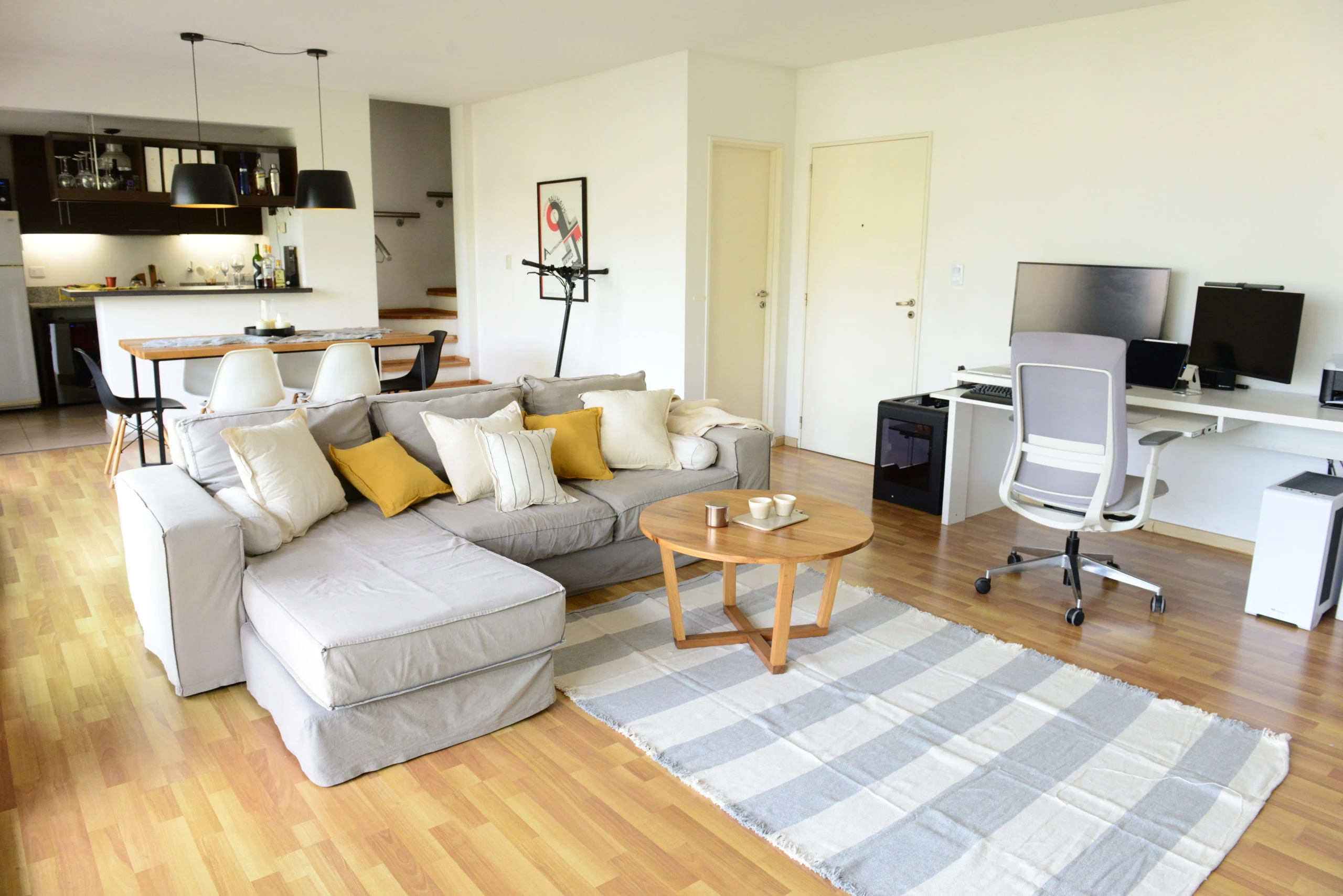 Trabajo y ocio se codean en el living, que acomoda un sofá en “L” con fundas de tussor gris, una mesa de petiribí redonda estilo Gervasoni y una alfombra rústica de 190 x 140 a rayas en gris y blanco (@mdhome.deco).