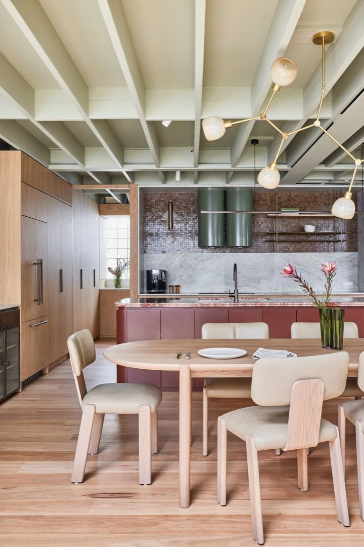 La cocina destaca por su isla con bordes de doble curva, elaborada en mármol Breccia Rosso en gamas del bordó y el rosado que combina a la perfección con los gabinetes de madera.