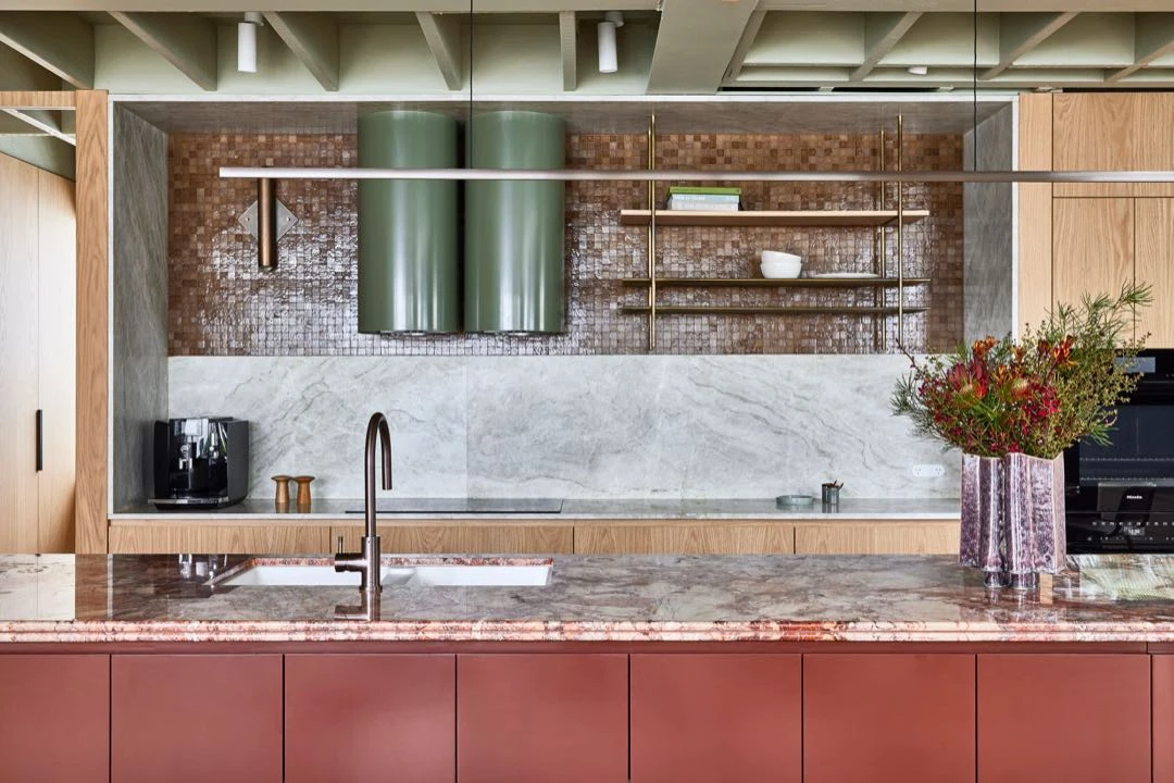 Las alzadas combinan mármol Carrara y venecitas en color bordó, mientras que para las campanas tubulares se apeló a un verde similiar al de los cielorrasos, pero más intenso.