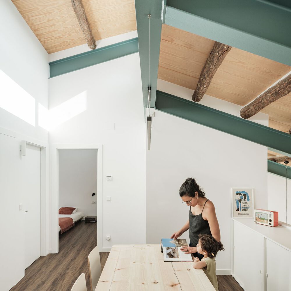 El proyecto a cargo del estudio de arquitectura Judit Falgueras plantea la nueva estructura metálica como un elemento clave que forma el forjado de primera planta y la rehabilitación de la cubierta, sustituyendo la antigua cercha española en mal estado por una viga Vierendeel que ilumina el distribuidor/estudio en la planta baja.