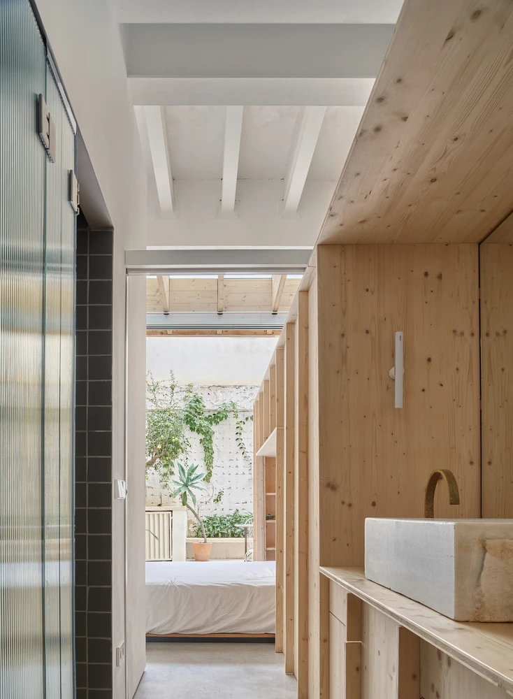 La distribución se generó a través de un mueble lineal de madera de abeto, que se coloca perpendicularmente al patio de tal forma que permita el flujo de luz entre patio y fachada, a la vez que divide la casa en dos zonas: las de día y las de noche.