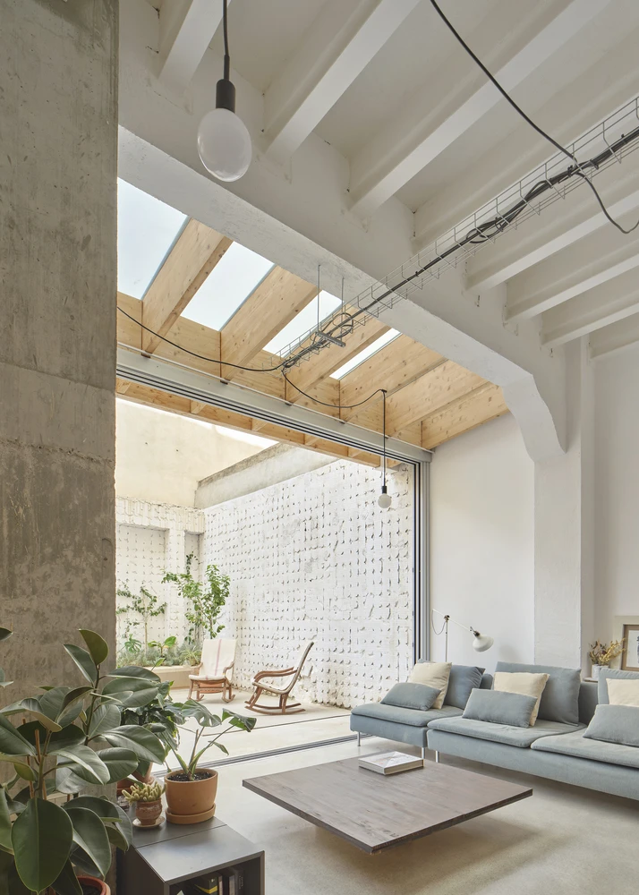 Para lograr la iluminación desea se recuperó el patio trasero tirando la cubierta de la antigua cocina. Se mantuvo la huella del alicatado como guiño y también para generar una textura que sirva de apoyo para las plantas del patio y de colchón acústico.