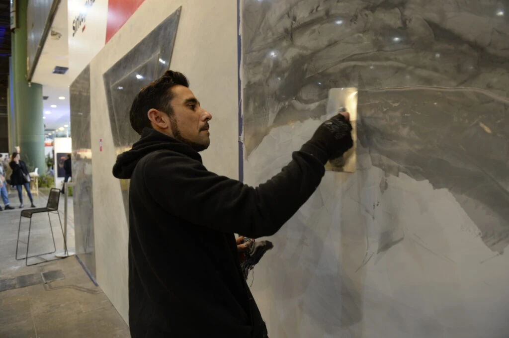 Una de las más destacadas fue la de Sinteplast, que presentó la aplicación en vivo de sus dos estrellas de la decoración: Microcemento en Pasta y Estuco Veneciano, en colaboración del artista Leo Flecha (@revestimientos_artisticos).