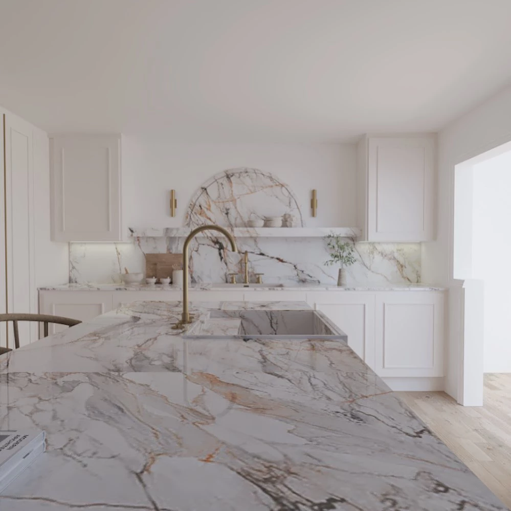 Y no hay dudas de que la reina absoluta del espacio será la piedra veteada en diferentes tonalidades presente en todas las mesadas.