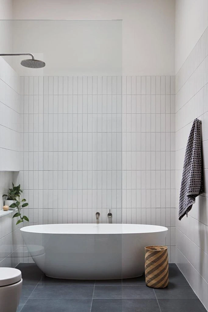 Una forma diferente de colocar los azulejos con la junta corrida es aprovechar la horizontalidad de los azulejos subway para colocaros en el sentido inverso, es decir, en forma vertical. Esta disposición tiene la virtud de crear un efecto de techos más altos.