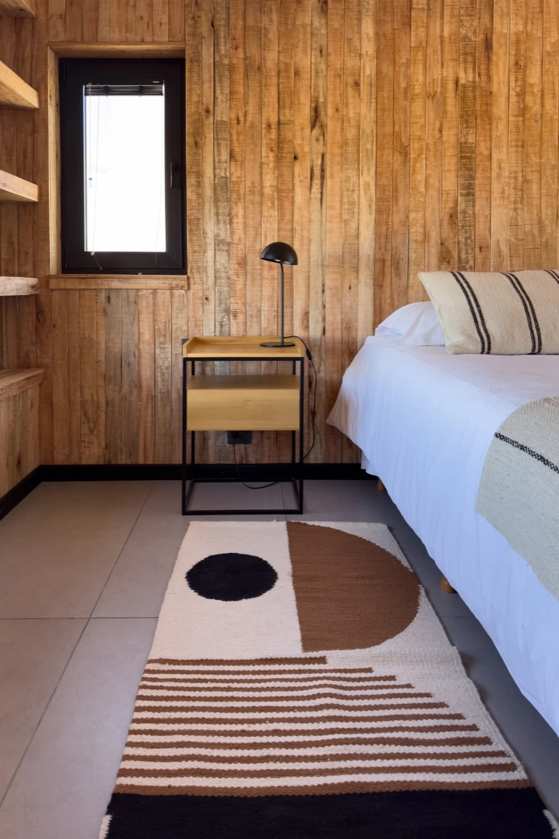 “Nuestro aporte general fue generar un interiorismo cómodo, funcional, de bajo mantenimiento y bien neto. Quisimos que el protagonismo fuera el de las ventanas con el paisaje exterior. El toque de color lo pusimos en las alfombras que están a ambos lados de la cama (@caucus.lab) que nos fascinaron por su geometría y colores. Y utilizamos colores tierra para no desentonar con la colorimetría propia de la estepa patagónica y del mar”.