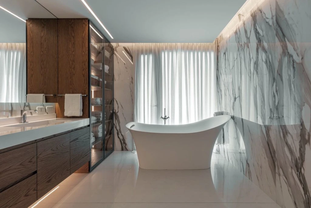 Muchas marcas de diseño supieron aprovechar esta tendencia incorporando materiales innovadores como piedra natural, acrílico o incluso cobre, lo que eleva aún más la estética del baño.