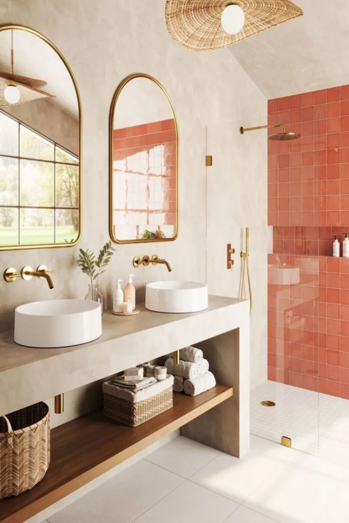Si querés salir de lo común, el terracota es la clave. Este tono rojizo aporta calidez sin perder sofisticación. Animate a usarlo en una pared o en detalles que se destaquen, como estanterías, espejos con marco a juego o en la pared de la bañera/ducha.