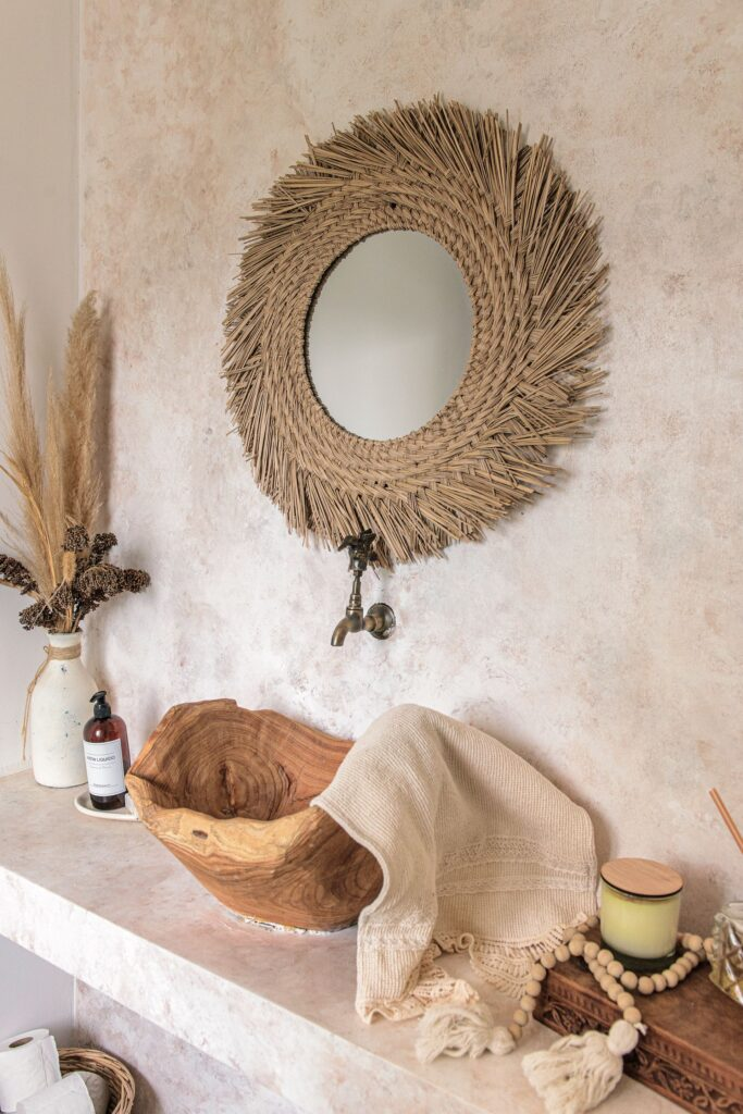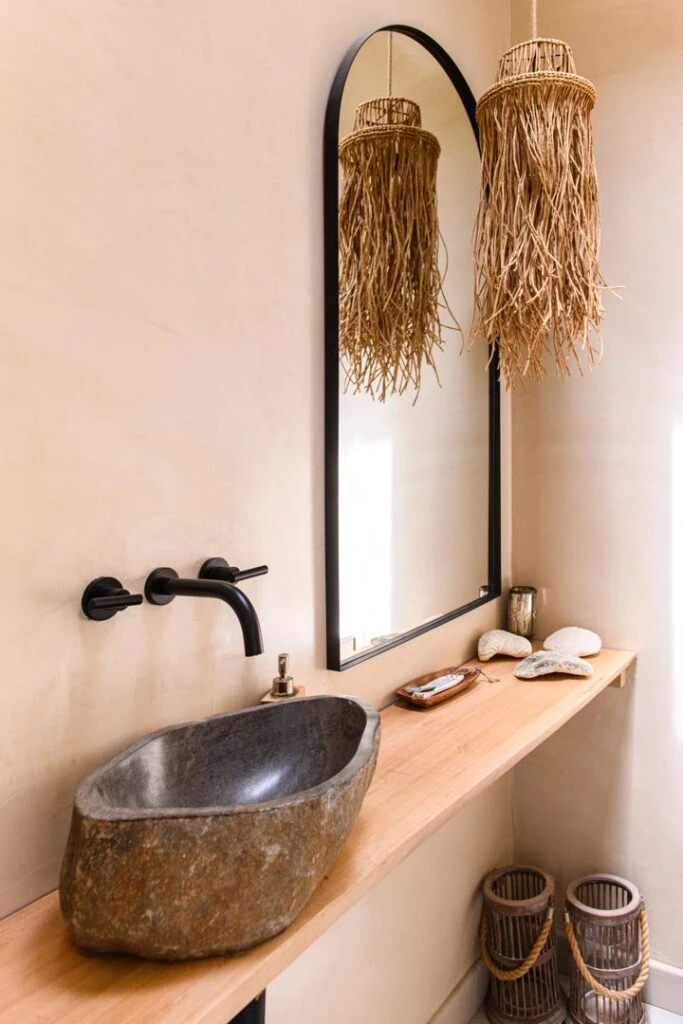 Plantas, madera, fibras: todo lo que conecta con lo natural se vuelve clave. Un banquito de petiribí, una canasta tejida o una planta colgante bastan para transformar el clima general del baño. La consigna: que entre la calma.