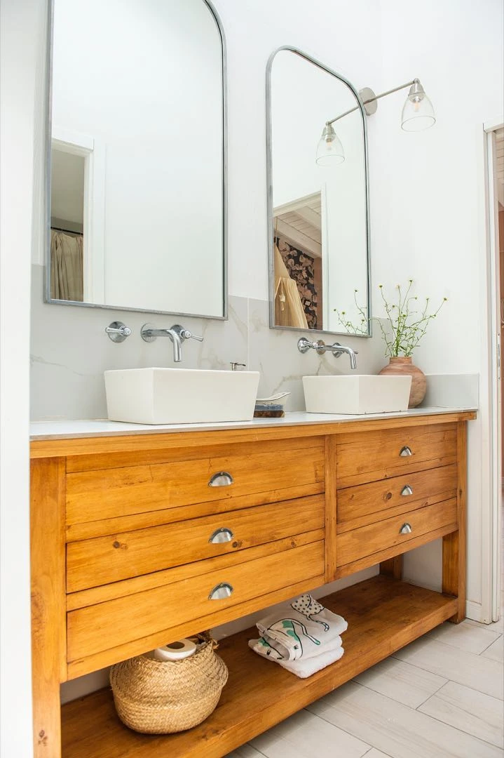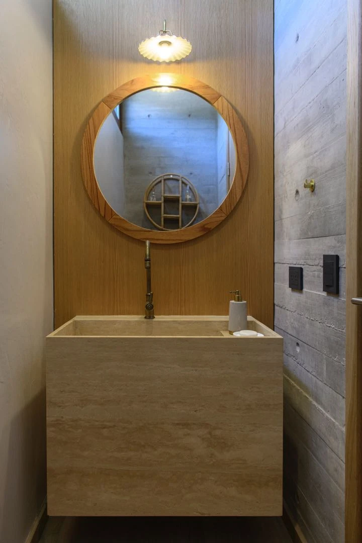 En el toillete de la misma casa, una gran bacha de travertino sin pulir (Navarro Hache) encuentra compañía en un espejo con marco de madera (@houseofgriga).