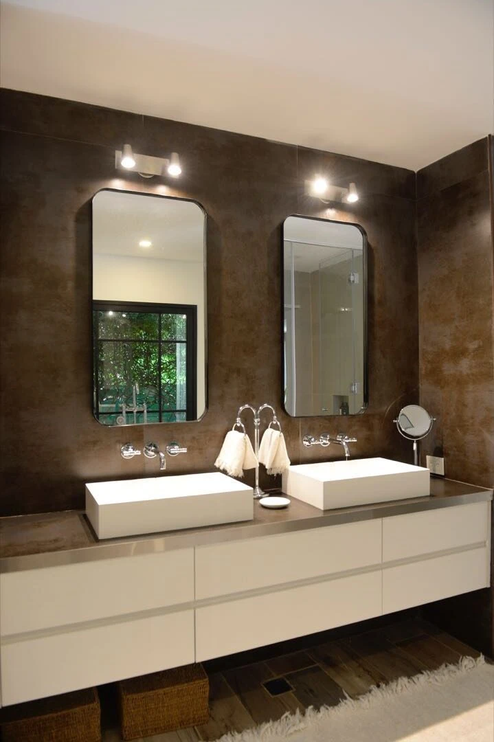 TRAVERTINO, UN MUST EN BAÑOS. Pulido o rústico, el mármol travertino se impone como un favorito para baños. Aquí aparece como protagonista de la mesada de travertino pulido con doble juego de bachas (Navarro Hache) que apoya sobre un mueble en melanina símil madera Hickory natural (Egger). Lo completan las griferías de pared en bronce viejo (Robinet) y el espejo con marco en la misma madera.