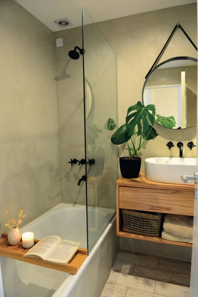 El baño principal del departamento en PH de la decoradora y estilista Malu Satzger se hizo a nuevo con paredes de cemento alisado. Tiene un mueble enchapado en madera paraíso (@pisandoviruta), espejo redondo negro con tira de cuero y griferías en color negro mate, muy tendencia (Peirano). Se suma una monstera deliciosa para sumar un toque de verde.