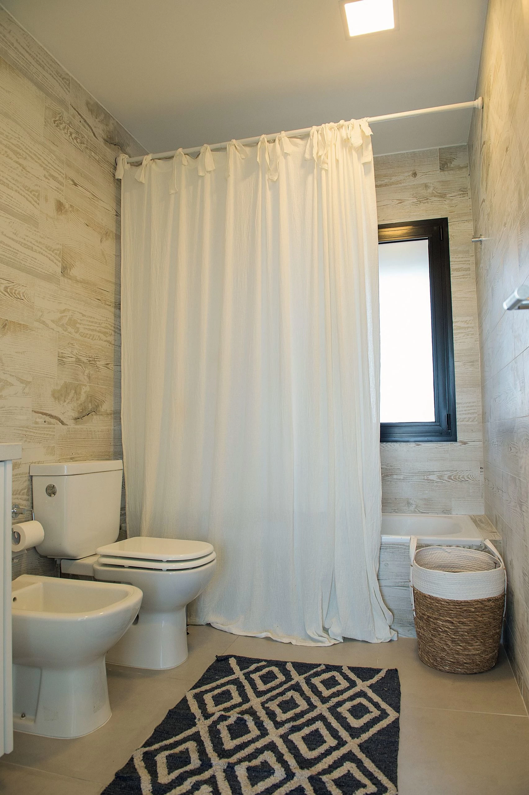 El hidromasaje tiene un cruzabañera de madera (@ce.ce_piume) con recuerdos del mar, caracoles y velas. Difusores (@vachi.byvalelagro). Las cortinas de teca patinadas en blanco, las de gasa rústica con volados de la zona de ducha, junto al espejo de kiri y el toallero de mimbre (@ce.ce_piume) le dan calidez a este baño soñado.