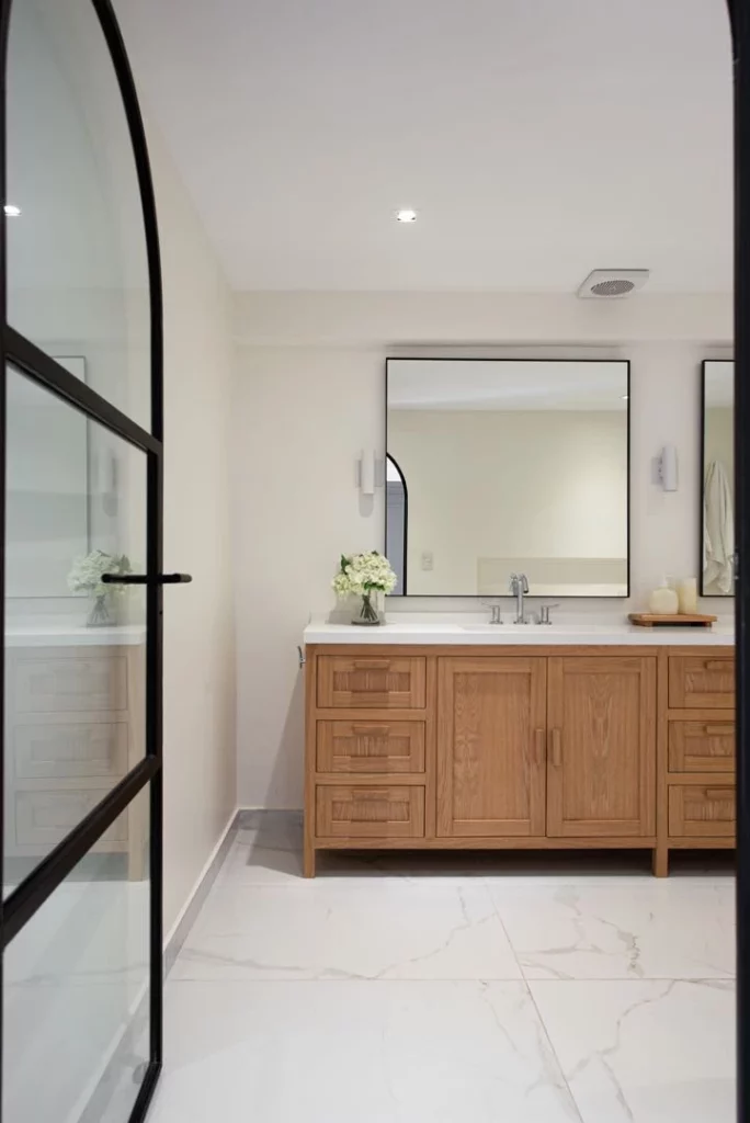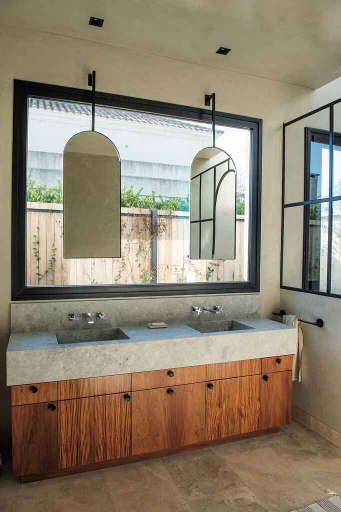 El mueble vanitory está enchapado en madera, con mesada Tundra Grey (De Stefano) y griferías (FV). Dos espejos hechos a medida, con arco de medio punto, cuelgan sobre el gran ventanal fijo.