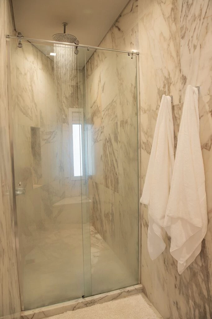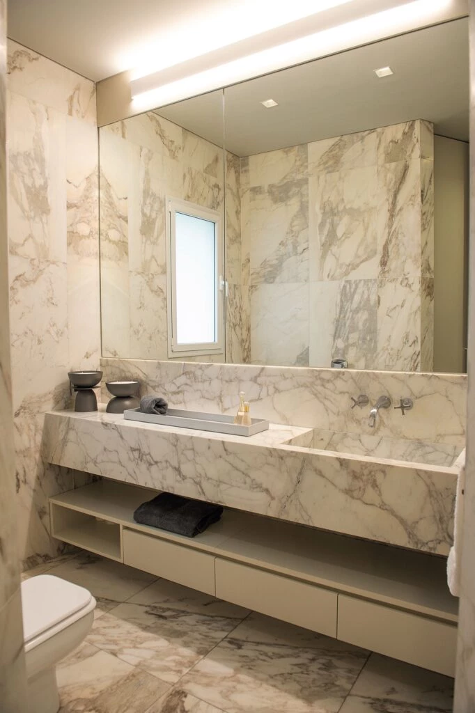 El piso y la pared de la ducha llevan porelanatos símil Calacatta pulido en placas de 60 x 1230 cm (Vite) mientras que el resto de las paredes llevan microcemento blanco. Grifería de mesada modelo Libby (FV).