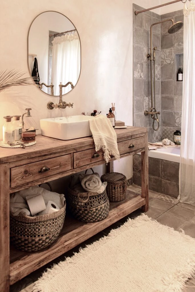 Los dueños de esta casa decorada con estilo de playa querían un baño principal que transmitiera relax y destilara cierta rusticidad. Y lo lograron. El protagonista del espacio es el imponente mueble vanitory realizado en pinotea (diseño de los dueños de casa ejecutado por @losdiazdemario) con canastos enormes para las toallas lisas y con puntillas (@cane.deco y @bonhomia_deco_textil). El box de ducha tiene paredes y piso en cerámicos modelo Calcáreo Deco Tostado (@cerronegroarg).