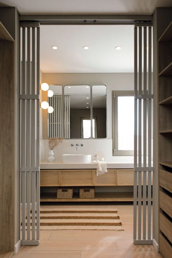 Unas puertas varilladas corredizas tamizan el acceso al baño en suite, también diseñado por Bélgika Home. De frente, se destaca el mueble vanitory en madera de kiri laqueado extra mate (realizado por @ceferinocasa) con mesada y alzada de Silestone Yukon (@canterasdelmundo). La bacha de apoyo es del modelo Milos Oval (Ferrum), con grifería de la línea Temple de pared (FV).