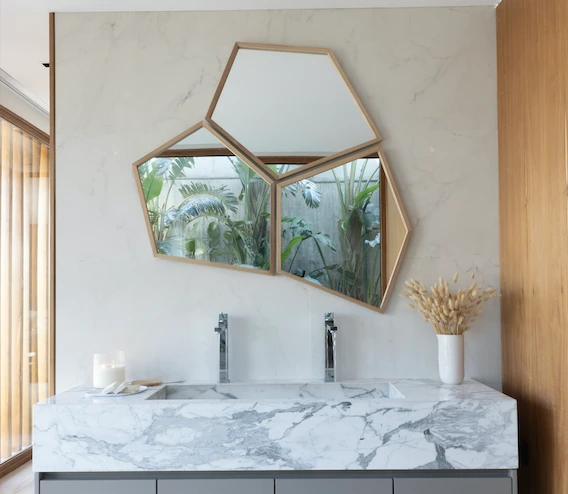 Un espejo tipo tríptico, de formas irregulares y ángulos cerrados con marco de madera maciza, impone sus reglas en este moderno baño con diseño de Angeles Bradley de (@oliviad.homedecor).