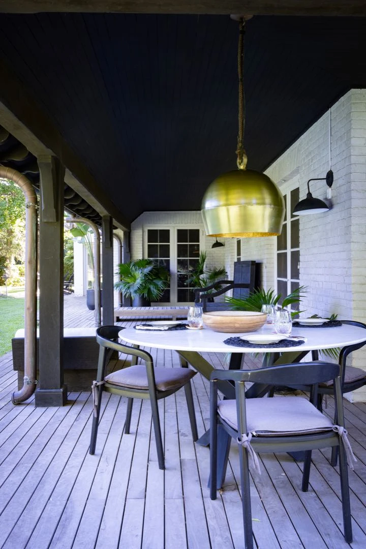 En las galerías se sostuvieron los techos bajos originales y los pisos de lapacho, se incorporó madera en algunos sectores y se armaron distintos spots de uso, como esta mesa redonda para desayuno o para tomar el té con lámpara dorada como remate: una señal que anticipa el estilo de los interiores.