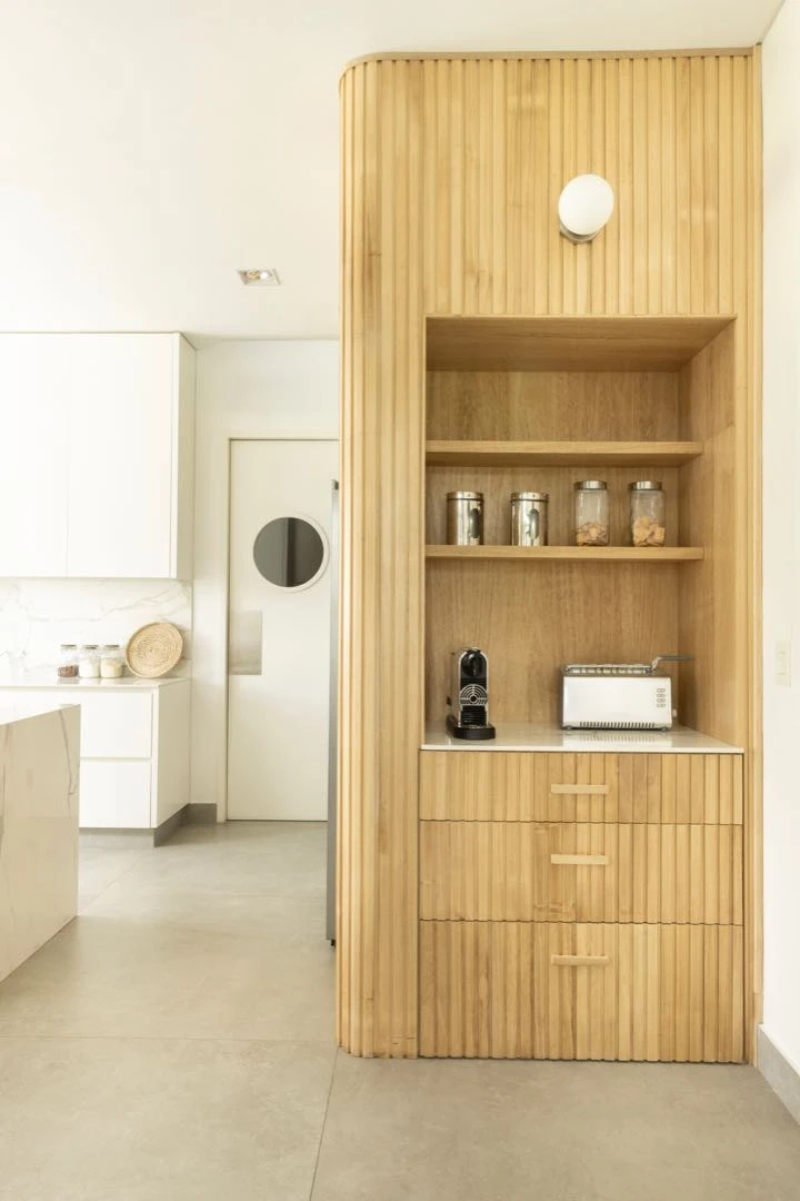 Un módulo “Coffee Station”, con diseño alistonado y curvo también en madera de kiri con mesada en Calacatta, se roba todas las miradas. La puerta con ojo de buey estilo bar comunica al mudroom de la casa o al hall de distribución.