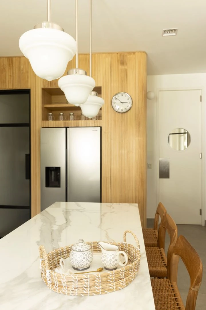 Las mesadas son de Neolith Calacatta Silk (De Stefano) con grifería (Hansgrohe). En el centro, una isla que organiza el espacio y es el lugar para el desayuno todas las mañanas, combina la mesada en el mismo Neolith Calacatta Silk con un cuerpo revestido en un envarillado de madera de kiri.