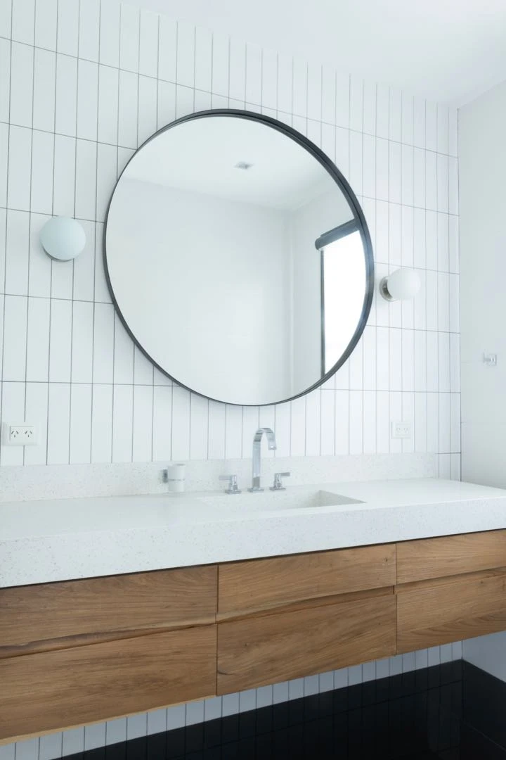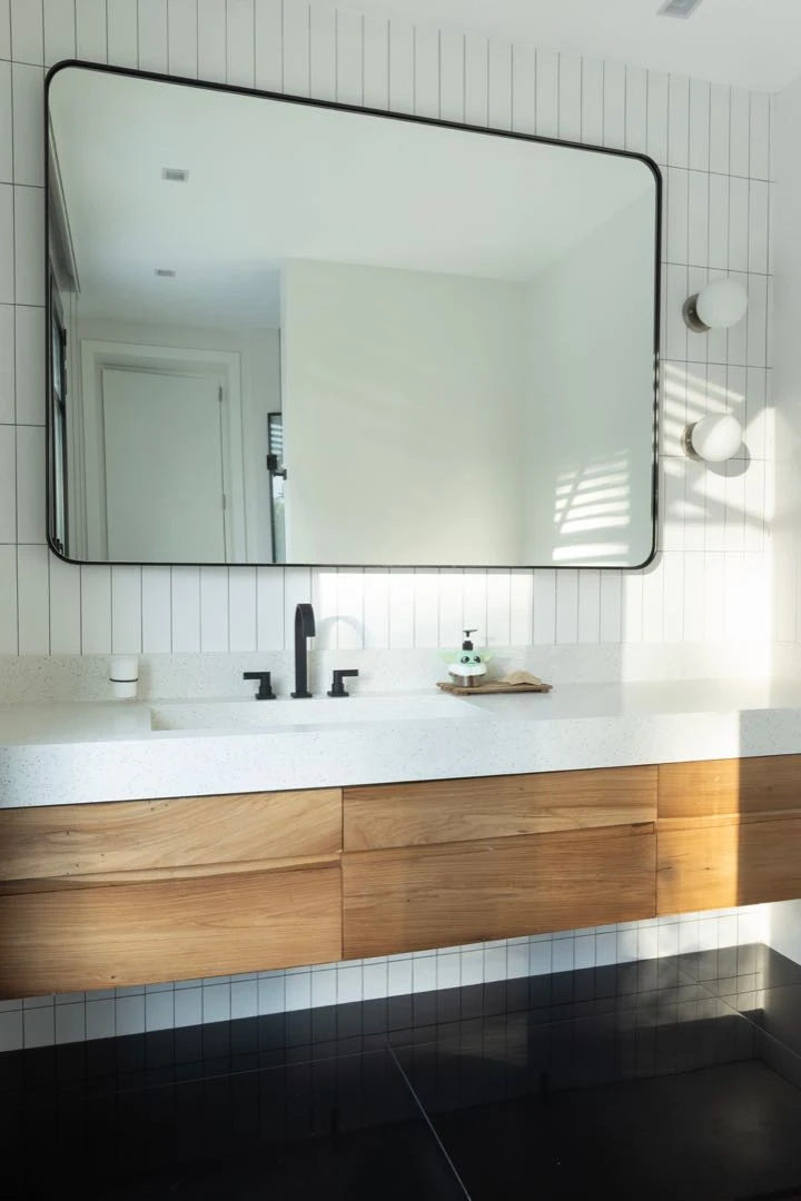 Para el resto de los baños de la casa se optó por una estética más moderna, con pisos de porcelanato color negro (SBG) y revestimientos de cerámicos tiles blancos (Syria Cerámicos). Las mesadas son de Purastone Terrazo White con griferías modelo Monza en negro mate (Robinet). Al igual que en el baño principal, apoyan sobre un mueble voladizo hecho en madera de petiribí (Amazonia).