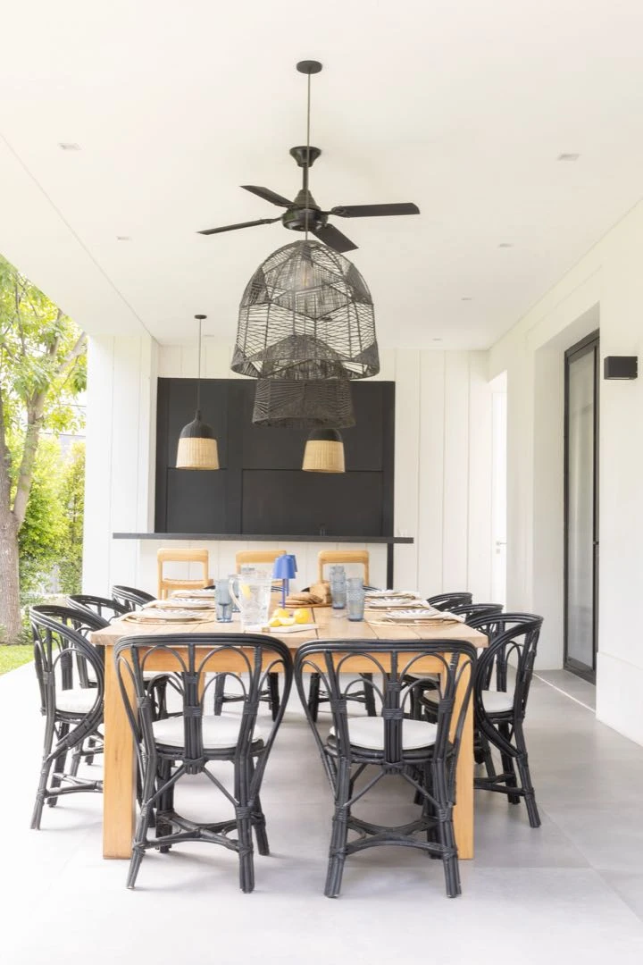 En otro sector, junto a la parrilla, una mesa de grandes dimensiones invita a compartir asados con familia y amigos. Su diseño es con base y entablonado de madera de incienso laqueado (FaHomeDesign) y se acompaña de sillas modelo Mar del Plata pintadas en color negro (Sillas del Mar), con almohadones en tela náutica color off white (AbaxDeco).