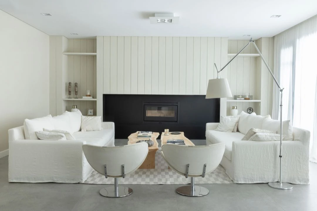 Sólo una moderna chimenea enmarcada con una chapa negra de grandes dimensiones, aporta contraste sobre la pared revestida en machimbre blanco. En la deco sorprenden los sillones vestidos con fundas de lino blanco, que fueron hechos a medida en 3 metros de largo (@_ab.interiordesign).