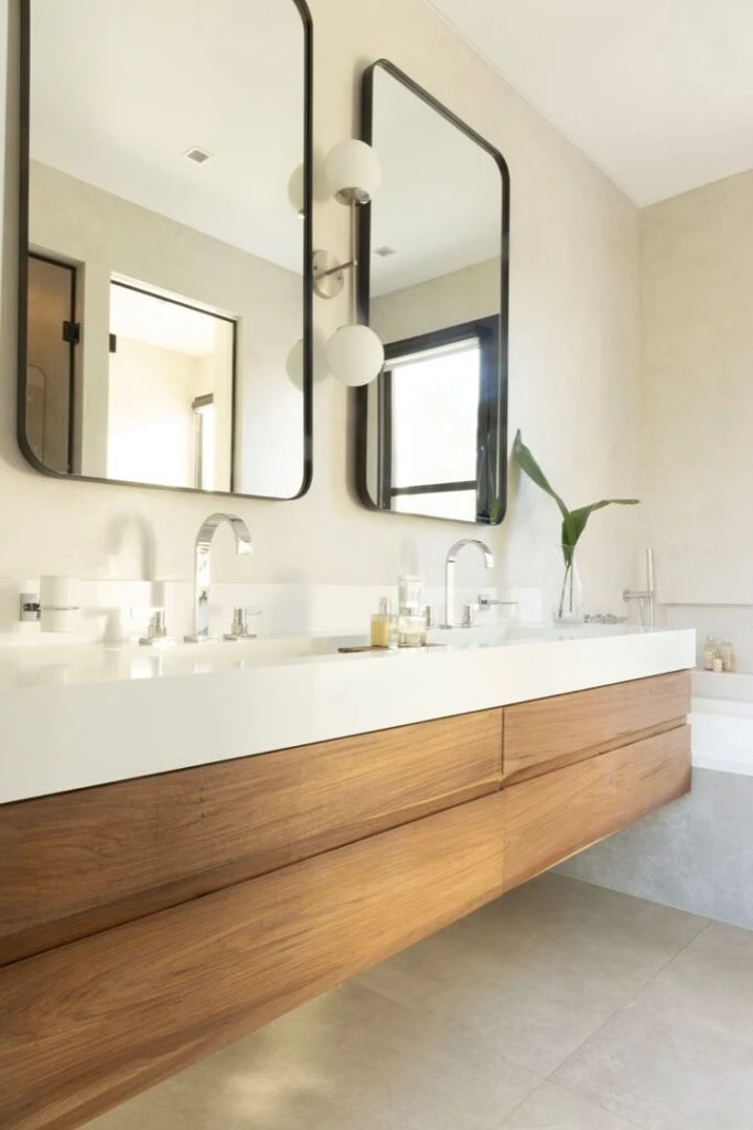 La mesada con bacha doble es de Purastone color Blanco Icon (De Stefano) y apoya sobre un mueble con cajonera doble realizado en petiribí mate (Amazonia). Griferías cromadas (Monza, de Robinet) completan el diseño junto al dúo de espejos con marcos de hierro negro (QFurniture).