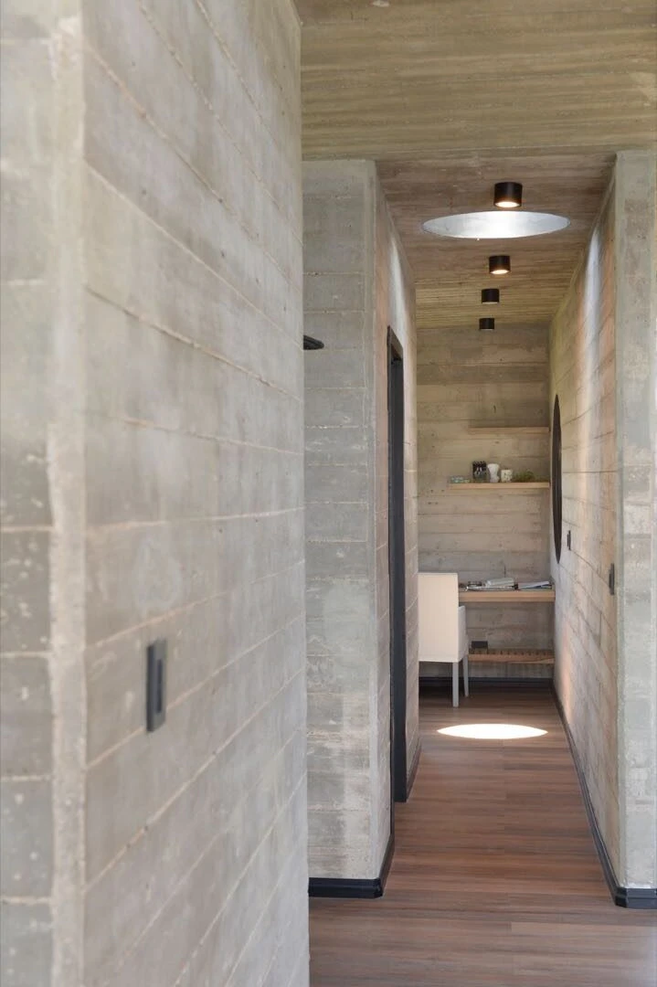 El encofrado, realizado con tablas de 15 cm, le confiere una textura rústica a las superficies, generando un lenguaje potente y brutalista.