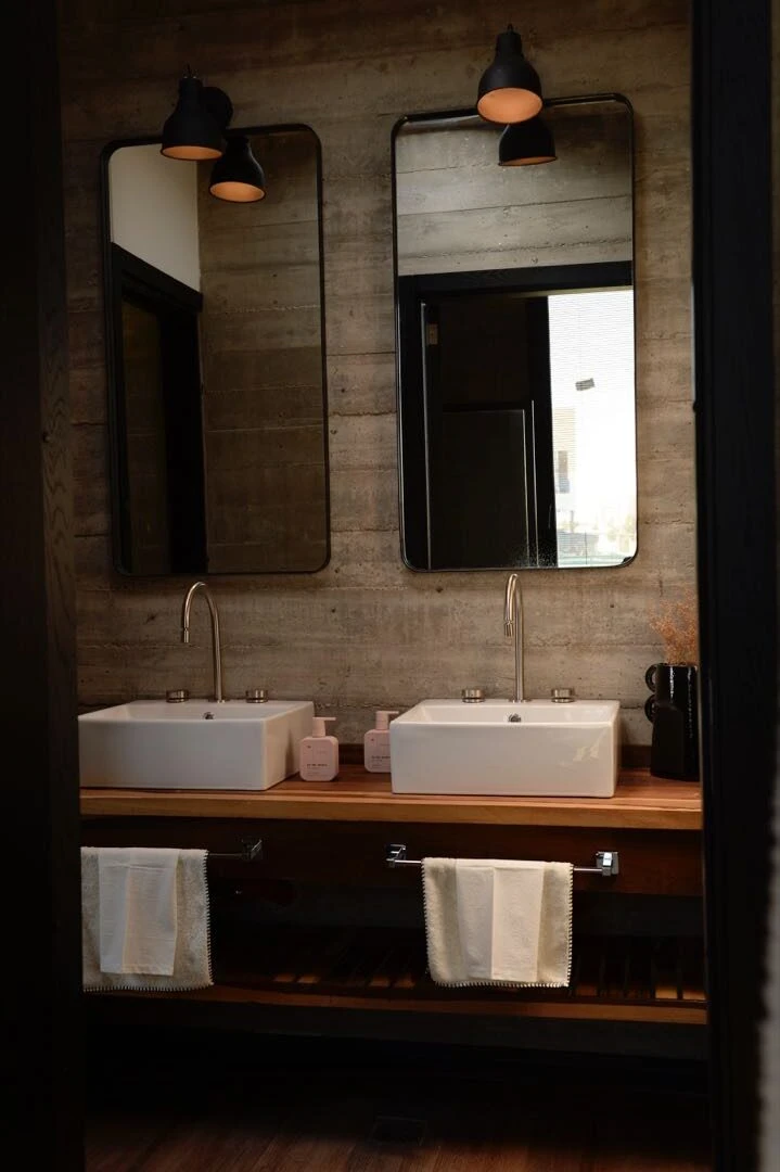 Estucado negro para uno de los baños , con vanitory en madera de guayubira natural y bachas sobre mesada (Piazza). Florero de vidrio humo, diseño de la dueña de casa. El baño principal tiene un vanitory de 2 metros de largo en guayubira natural, con una bacha sobre mesada de cerámica blanca (Piazza).