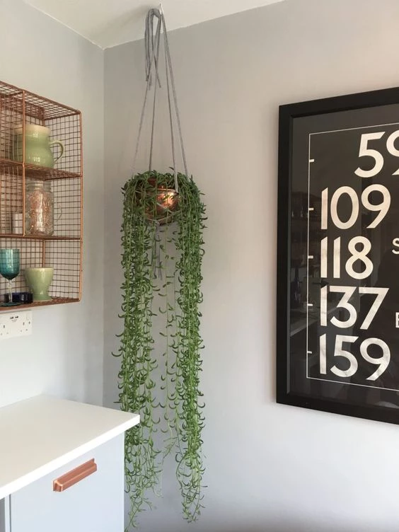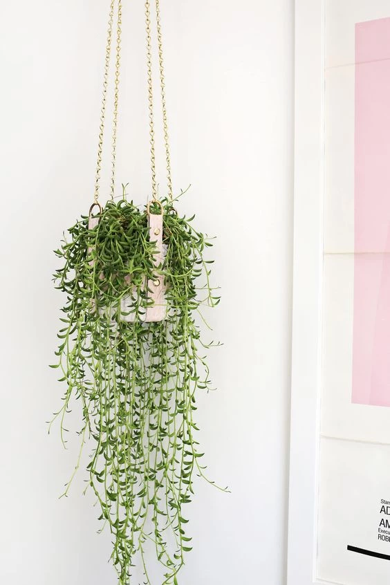 También puede colocarse en composición con otras suculentas colgantes, como el collar de corazones, la planta de rosario o la cola de burro, y formar una especie de jardín vertical súper chic.