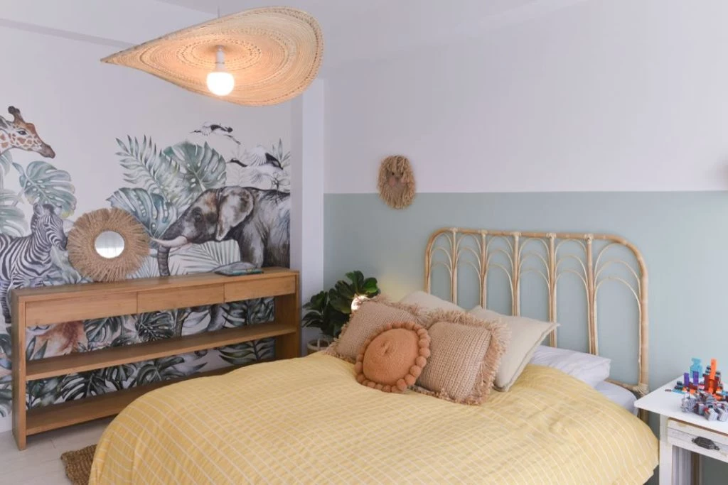 Para resolver el cuarto de Pedro se pensó en sus gustos: los animales de la selva y el color amarillo. El resultado es dormitorio cálido, relajado y sin exceso de información visual (ergo, ideal para dormir). La cama lleva un respaldo de caña (@milvolando) y suma de un lado una mesita tronco (@hiplantaok). Almohadones (@ayqueamo) y alfombra camino de yute (@marhaba_carpets).