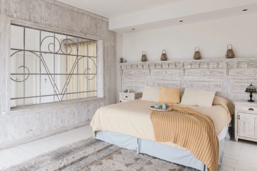 Como respaldo de la cama un tremendo cabecero de madera patinada que va de pared a pared, con detalles de molduras artesnales (@yrigoyenbuenosaires) y trabajado en el mismo estilo que las mesas de luz.