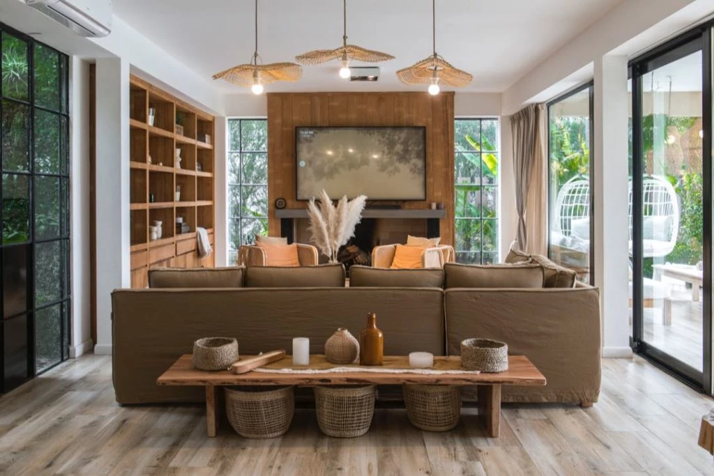 El gran sofá en “L” (@dellacasa) es el amo y señor de este luminoso living y apoya sobre una alfombra trenzada en dos colores (@compañianativa). Lo completan almohadones (@solpaloudeco), lámparas muy livianas de fibras y, a sus pies, una mesita de fibras naturales en la que nunca faltan las velas (@llum.velas) y los objetos de cerámica blanca (@blau_co).