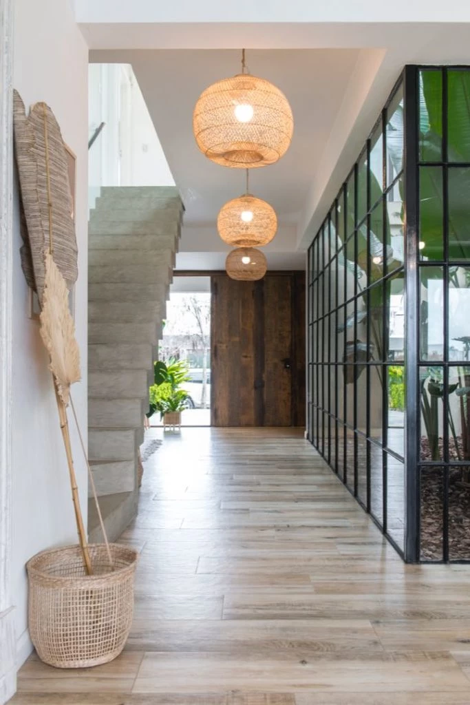 Toda la planta baja se comunica entre sí, tanto por el leguaje de la deco como por la circulación. En línea con la entrada aparece el box de hierro y vidrio que contiene al patio interior: un pulmón verde que se puede disfrutar desde distintos puntos de la casa. Los pisos son de porcellanato símil madera lavada y la escalera, de hormigón sin baranda. En el bajoescalera, un rincón deco con banco de madera y hierro, espejo ovalado y una frondosa Costilla de Adán.