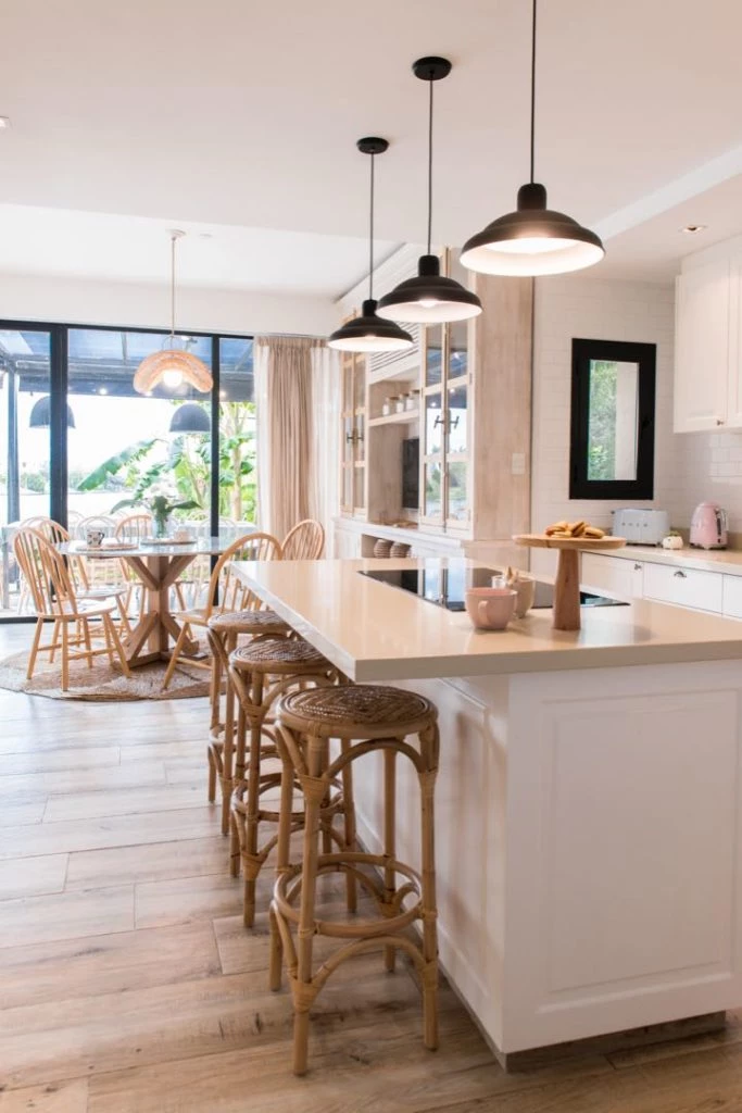 En la cocina se priorizó el color blanco con azulejos subway y alacenas y mesadas también en total white. La gran isla central, con anafe eléctrico, tiene mesada de Silestone y hacia ella se arriman unas banquetas de rattan. La mesa de comedor diario, con tapa redonda de mármol de Carrara y sillas estilo Newport, se ubicó junto a un gran mueble vajillero diseñado a medida de piso a techo (con estantes, puertas de vidrio y persianas) que además contiene la tevé.