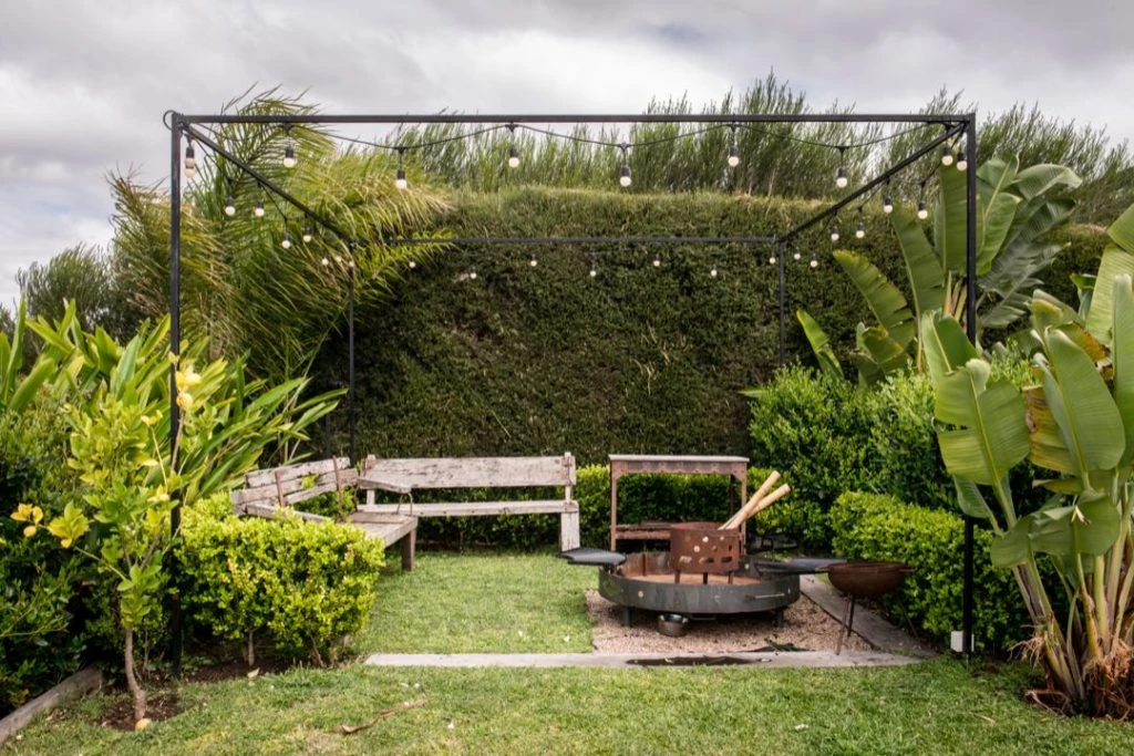 El sector fuegos fue fundamental en esta casa que priorizó el paisajismo. Bancos de madera rústicos, una mesa antigua y un fogonero de hiero (Tromen) conviven bajo una pérgola hecha por un herrero, con guirnalda de luces en combinación de focos amarillos y blancos.