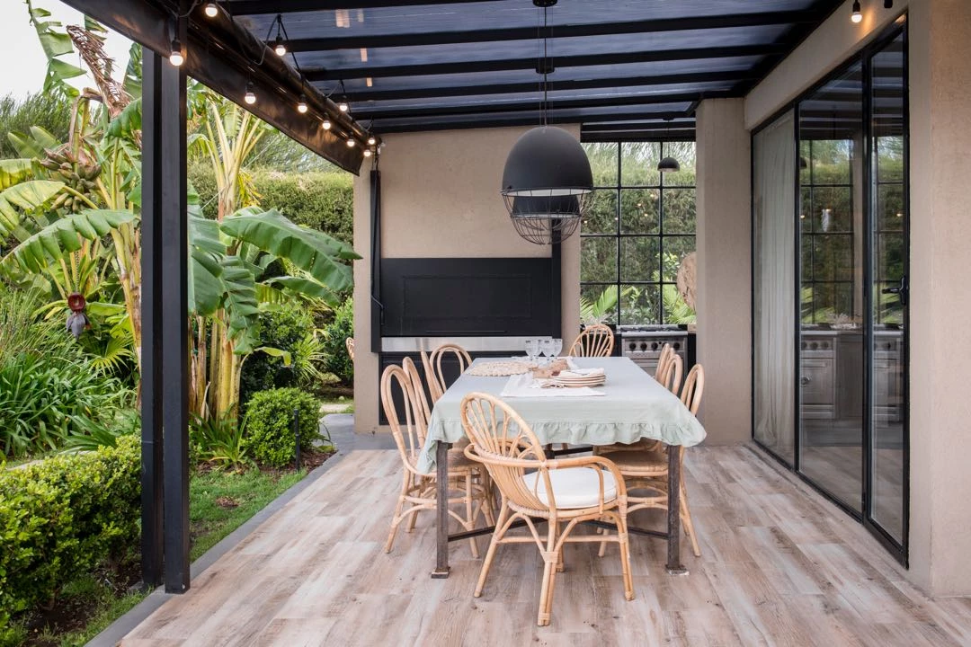 El sector fuegos fue fundamental en esta casa que priorizó el paisajismo. Bancos de madera rústicos, una mesa antigua y un fogonero de hiero (Tromen) conviven bajo una pérgola hecha por un herrero, con guirnalda de luces en combinación de focos amarillos y blancos.