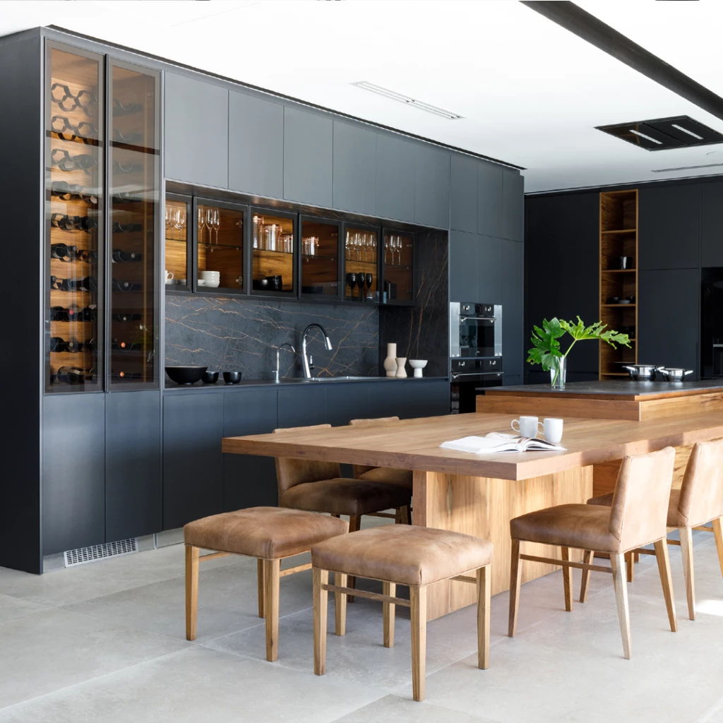 Para llegar al resultado, desde el amoblamiento combinaron laqueado gris semi-mate con madera lustrada petiribi natural. También incorporaron mesadas de Dekton Laurent, bodega y vajillero interior en madera con vidrio transparente bronce y marco negro.