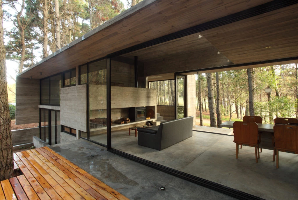 A medio camino entre estos lugares de descanso, se planteó la zona de reunión de la familia vidriada en sus lados mayores buscando las vistas lejanas al bosque vecino y al paisaje del propio lote.
