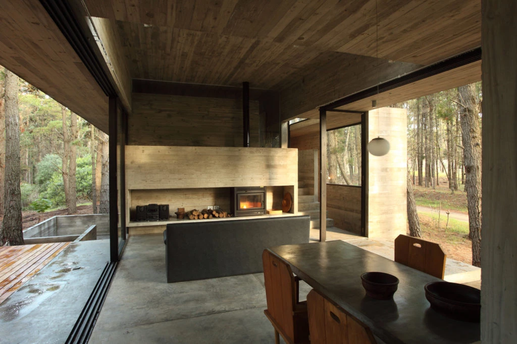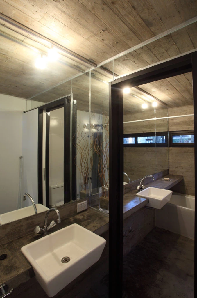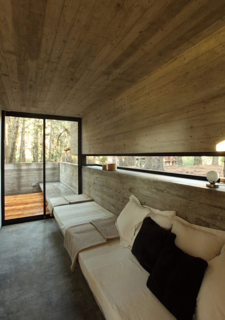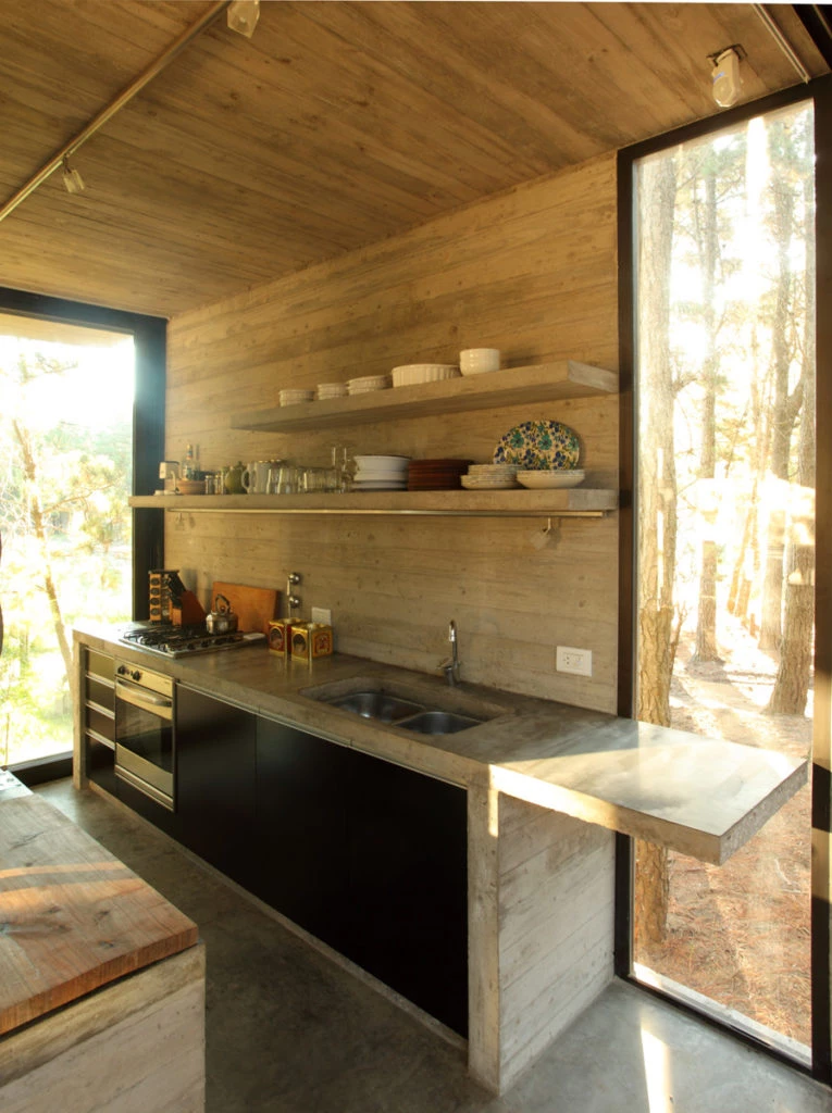Salvo la cama matrimonial, los sillones y las sillas, el resto del equipamiento de la vivienda está resuelto en hormigón. Incluso las camas de los dormitorios camarotes son losas perforadas resueltas en voladizo.