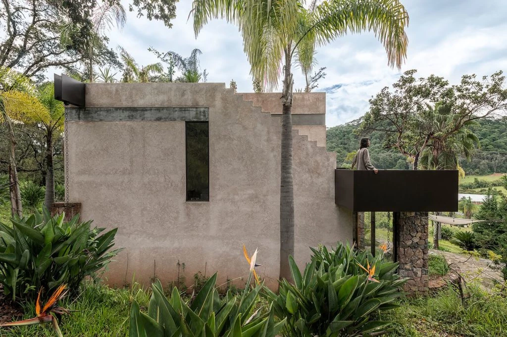 Partiendo de una basamento macizo y pesado de piedra, perforado por vanos y aberturas que encuadran las vistas como anotaciones del paisaje, gradualmente ampliando hasta ser absorbidos por el vasto espectro vegetal del entorno.