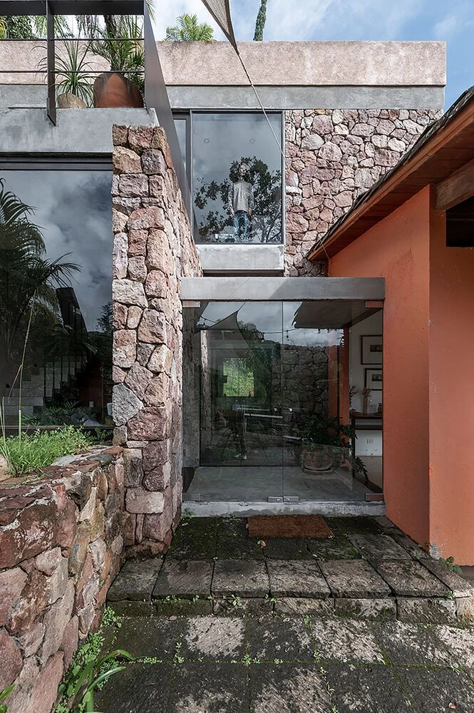 La adición no solo se apoya, sino que se carga a manera de tirante o liga transmitiendo los esfuerzos a través del sistema de vigas y losas para lograr eliminar el elemento de carga intermedio dentro del espacio, permitiendo una planta baja libre que se percibe ligera y fluida entre los tres niveles escalonados.