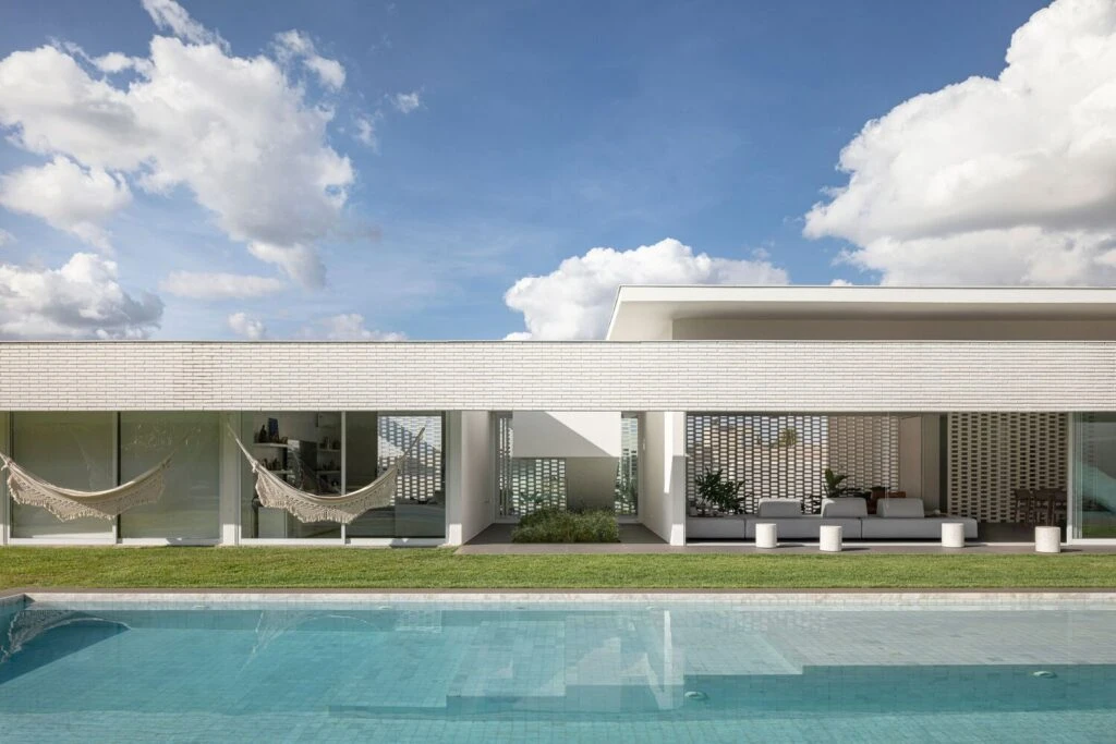 Construida en un complejo residencial de la región de Lago Sul, en Brasilia, el programa propone dormitorios, livings, balcones, cocina y hasta garaje distribuidos por el perímetro del terreno con el fin de que todos estos espacios se orientaran hacia el área central, con una gran zona verde y una piscina semiolímpica.
