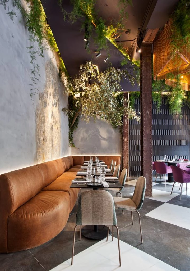 Ubicado en la planta baja, el restaurante de Casa Decor (espacio GM Modular) fue elaborado por Nothing Studio en clave de estilo industrial pero repleto de plantas colgantes y tapizados en cuero y terciopelo que aportan un toque más elegante y acogedor.