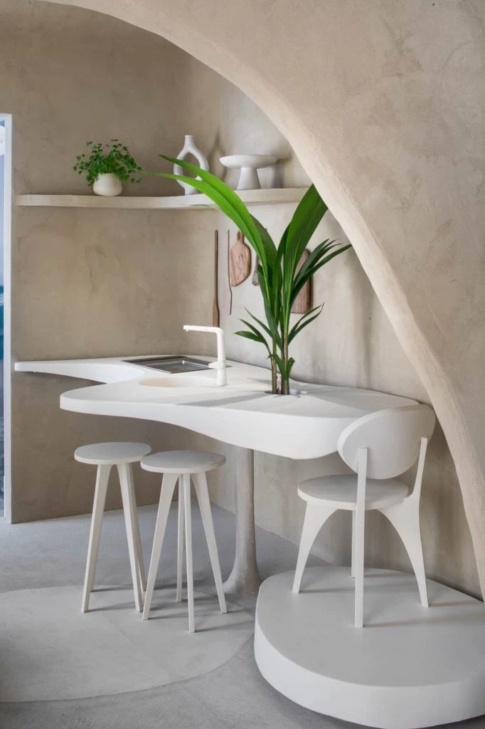 Todo el mobiliario es 100% sostenible y los electrodomésticos son eficientes ya que incorpora soluciones como heladeras que no necesitan electricidad y sistemas de acuaponía e hidroponía. Además, los colores y las formas elegidos aportan calidez y transmiten personalidad.