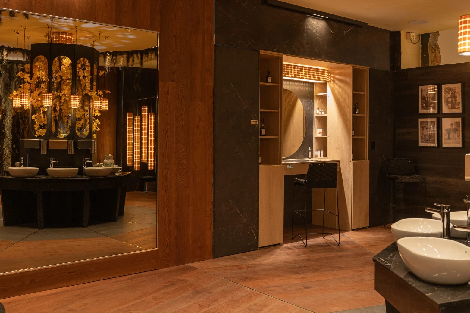 En lugar de los clásicos espejos, una ventana visual en melamina de Faplac enmarca un Ginkgo biloba. Este árbol es símbolo de introspección y conexión con las raíces. Y su elección busca recordar que “no necesitas verte en un espejo para encontrarte”.