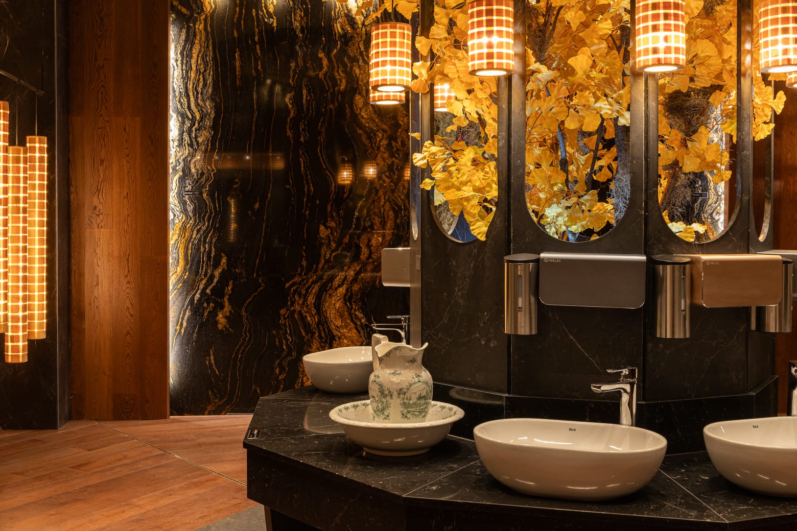 El espacio también incluye accesorios de última tecnología, como dispensers de jabón y secamanos automáticos.