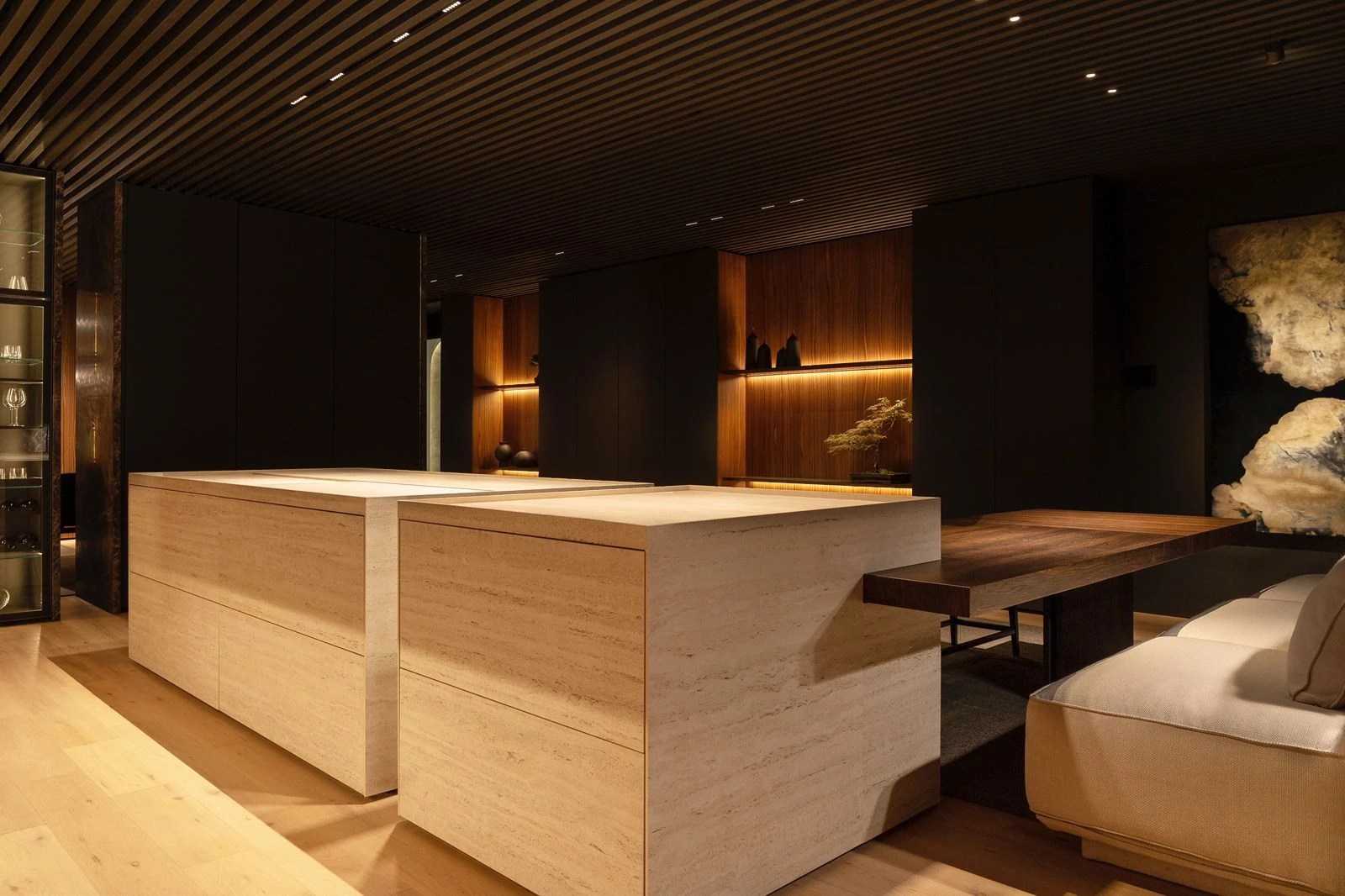 Los volúmenes de mármol Emperador Grey y las islas revestidas en Dekton Marmorio destacan como bloques escultóricos, aportando un peso visual que contrasta con la ligereza del mobiliario y sus líneas contemporáneas.